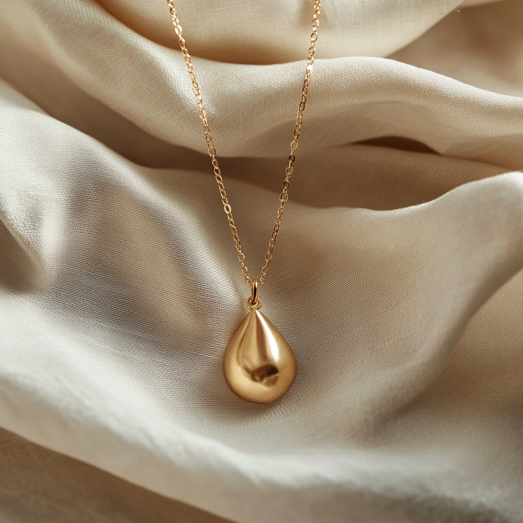 A delicate gold chain gracefully showcases a polished teardrop pendant, resting against a backdrop of soft, flowing ivory fabric. The pendant’s smooth, rounded form captures and reflects light beautifully, exuding a sense of warmth, simplicity, and quiet elegance. Perfect for everyday wear or layering, this timeless piece is a subtle yet radiant statement of refined style.